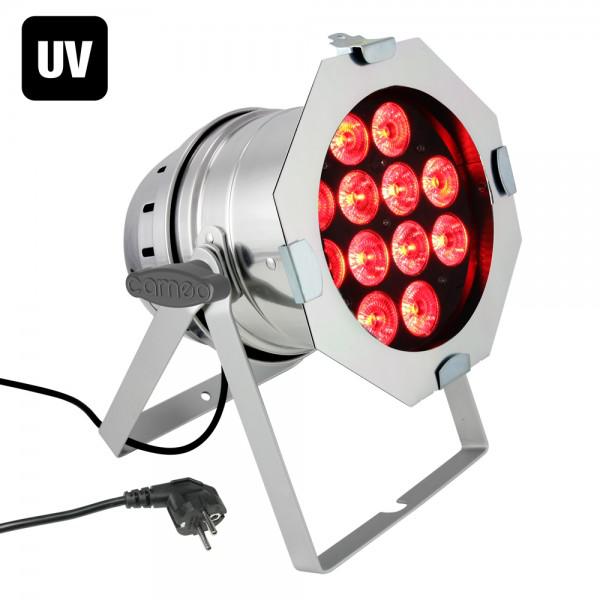 Cameo Led PAR 64 CAN RGBWA+UV - 12 x 10W, este un PAR64 profesional, echipat cu 12 LED-uri ultra luminoase de 10W (6 in 1 LED-uri). Spectrul lui RGBWA + UV, permite bogat si extrem de flexibil amestecul de culori. Acesta poate fi alimentat de la orice priza cu 110-250 V AC.