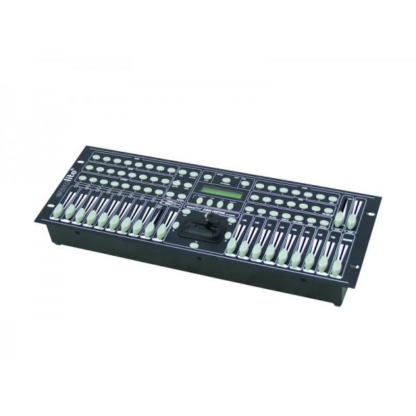 Controller DMX Eurolite 136 canale, echipat cu intrare separata pentru masina de fum, MIDI, RCA, Jack mare, functia black-out incorporata. Are 12 pagini cu pana la 8 scene programabile, 128 canale cu 8 scanere si pana la 16 canale DMX.