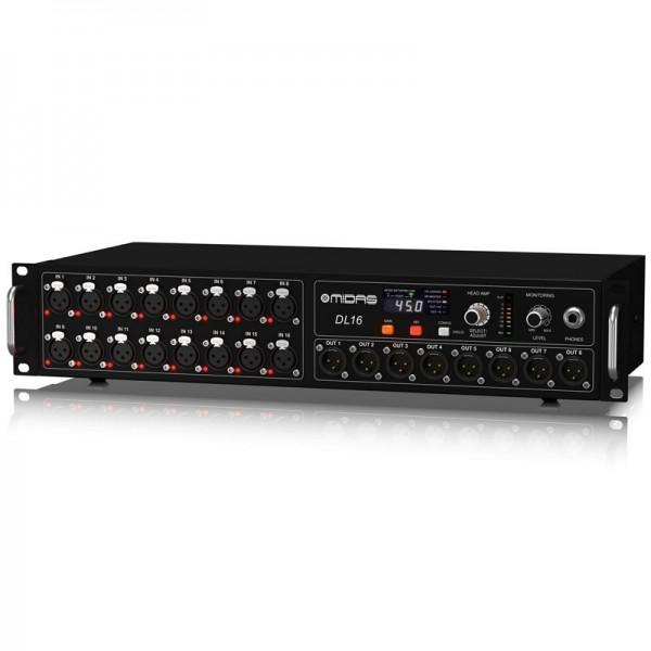 Stagebox-ul DL16 ofera 16 preamplificatoare Midas cu phantom power de +48 V, 8 iesiri balansate cu XLR, iesire ULTRANET pentru conectarea mixerelor Behringer P16-M plus conectivitate pentru echipamentele compatibile ADAT. La comanda